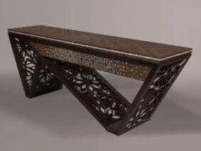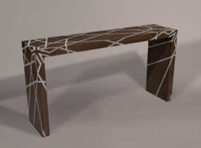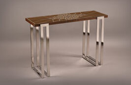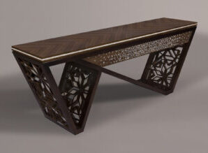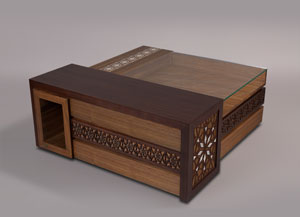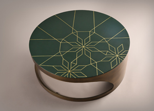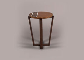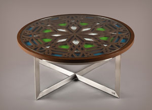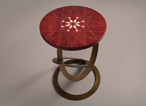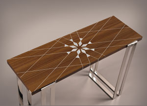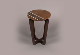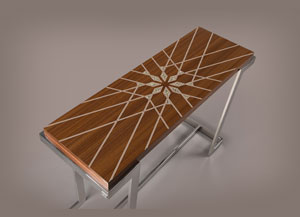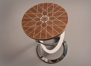 3. Center Table in dark Walnut wood top styled with Mother of Pearl and light veneer inlay with solid dark Walnut base.