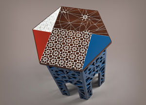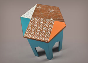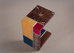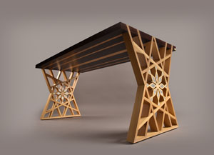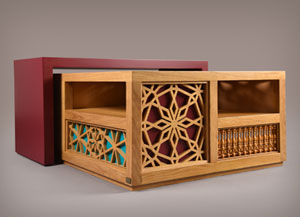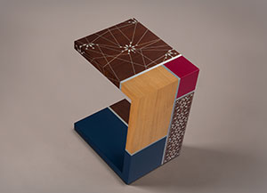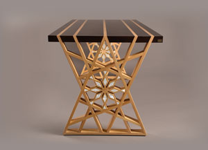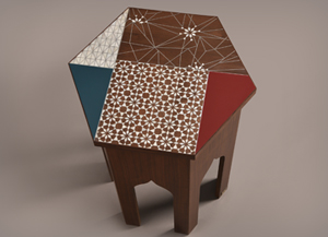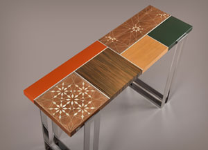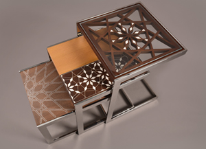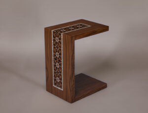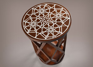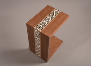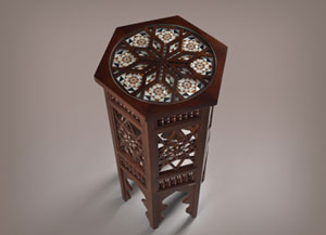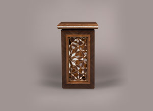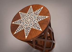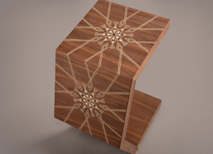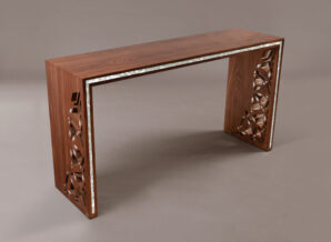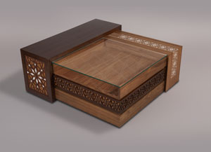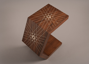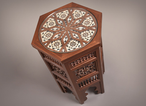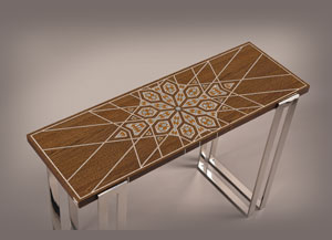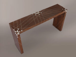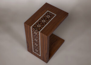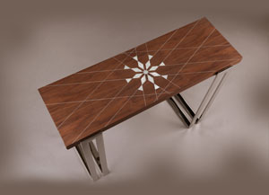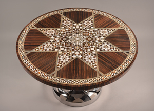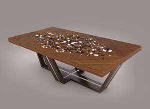 1. Center Table in patterned Walnut wood top styled with Mother of Pearl inlay and solid dark Walnut base with Mother of Pearl inlay.