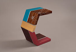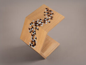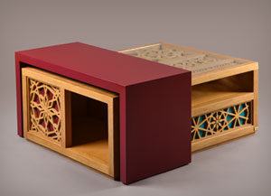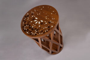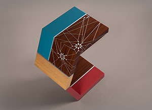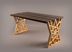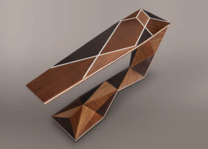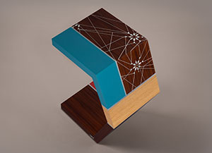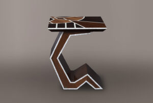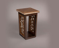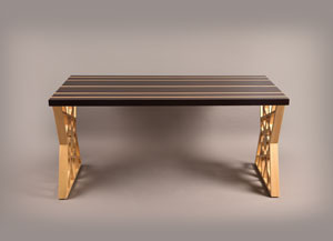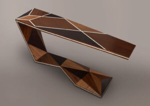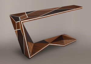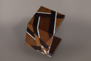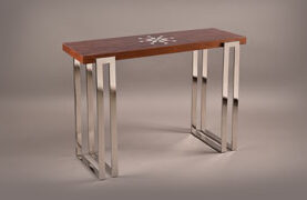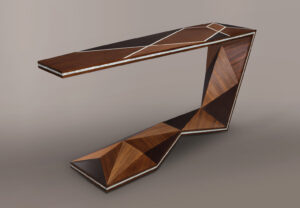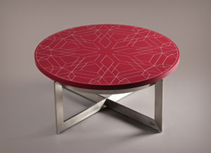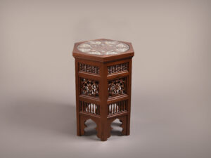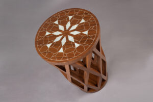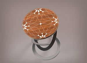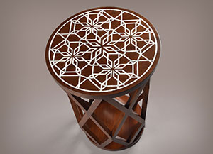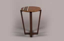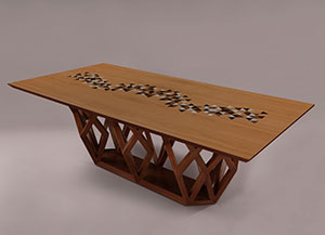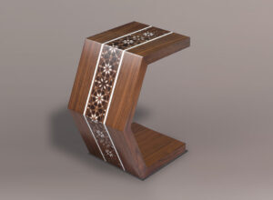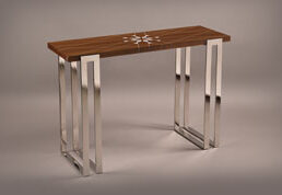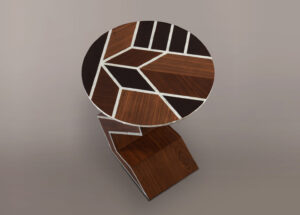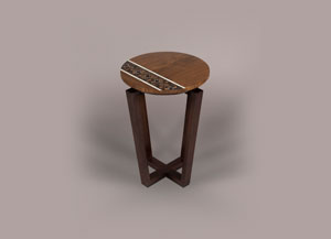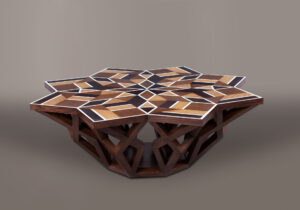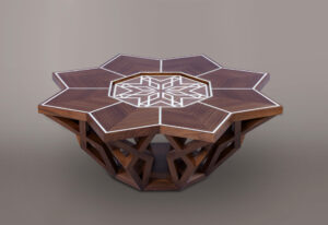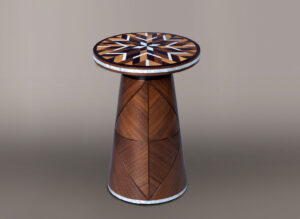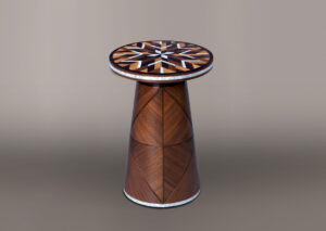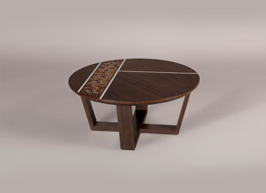 2. Center Table in dark Walnut wood top styled with Mother of Pearl and light veneer inlay with solid dark Walnut base.